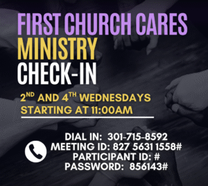 First Church Cares Ministry Check In Call-In Number: 301-715-8592 Zoom ID number: 827 5631 1558# Participant ID: # Passcode: ... 22 Apr 11:00 am - 1:00 pm VirtualVirtual